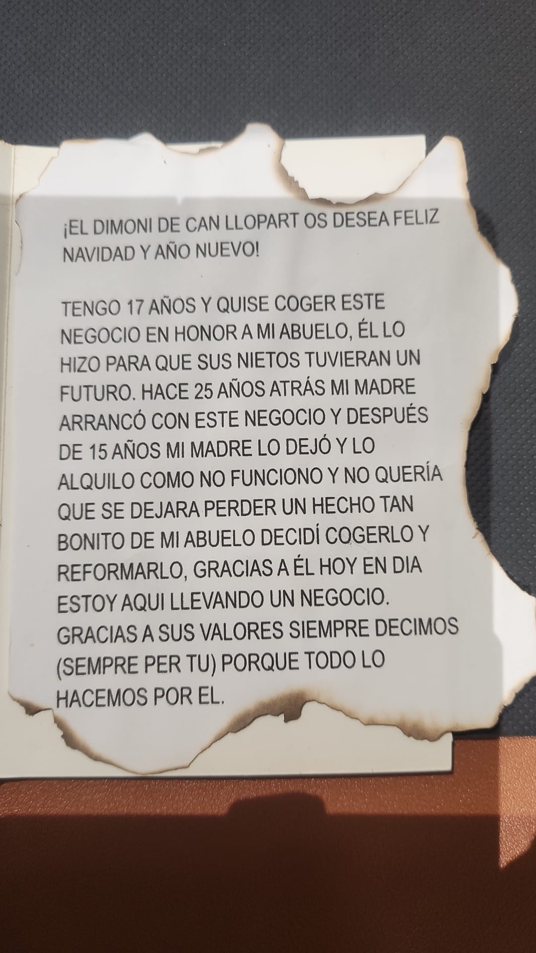 Tengo 17 años y quise coger este negocio en honor a mi abuelo. Él lo hizo para que sus nietos tuvieran un futuro. Hace 25 años atrás, mi madre arrancó con este negocio, y después de 15 años, mi madre lo dejó y lo alquiló, pero como no funcionó, no quería que se dejara perder un hecho tan bonito de mi abuelo. Decidí cogerlo y reformarlo. Gracias a él, hoy en día estoy aquí, llevando un negocio. Gracias a sus valores, siempre decimos (sempre per tu) porque todo lo hacemos por él.